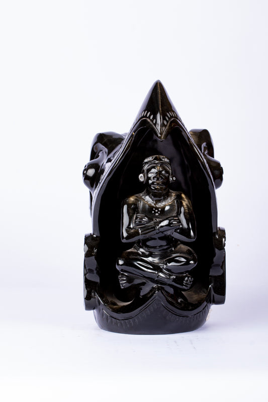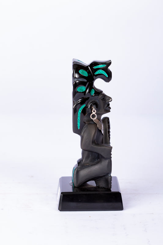 Guerrero Jaguar Meditativo en Obsidiana con Incrustaciones